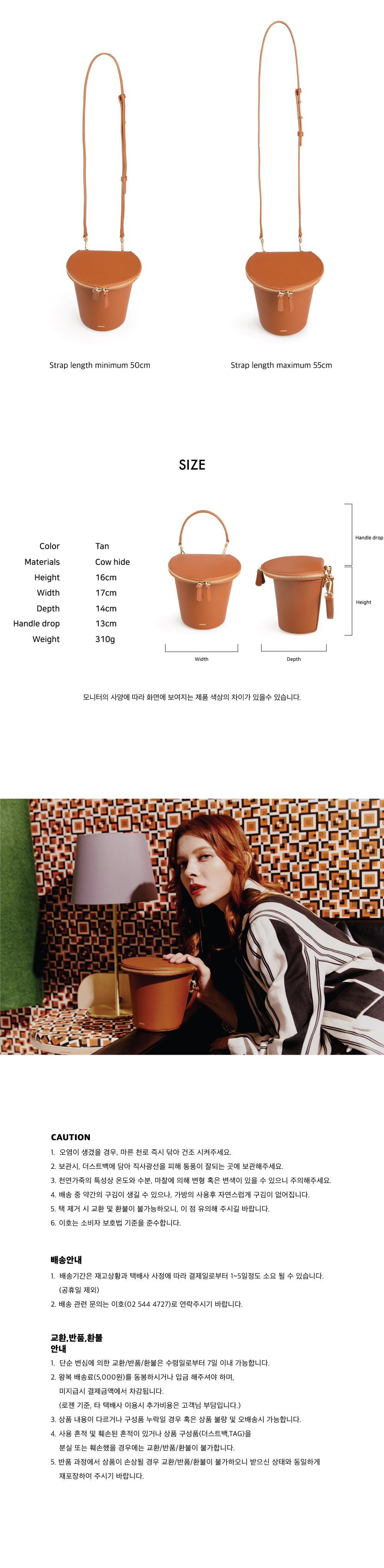 원형과 원통형이 합쳐진 형태로 상단에는 지퍼로 여밈이 되어 있으며 뒤에는 디링 장식으로 토트와 크로스가 다 가능한 스타일입니다.