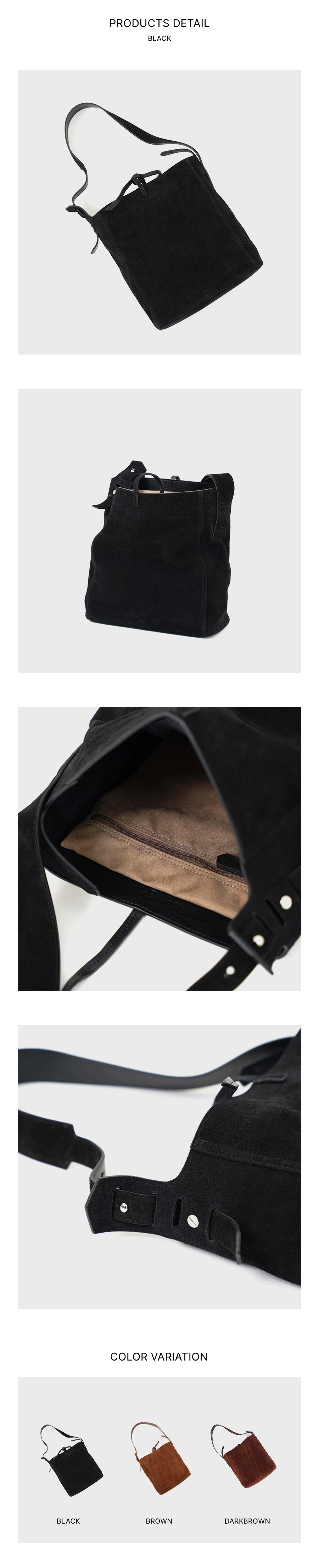 스웨이드와 가죽을 믹스하여 제작한 미니멀한 무드의 숄더백입니다.
