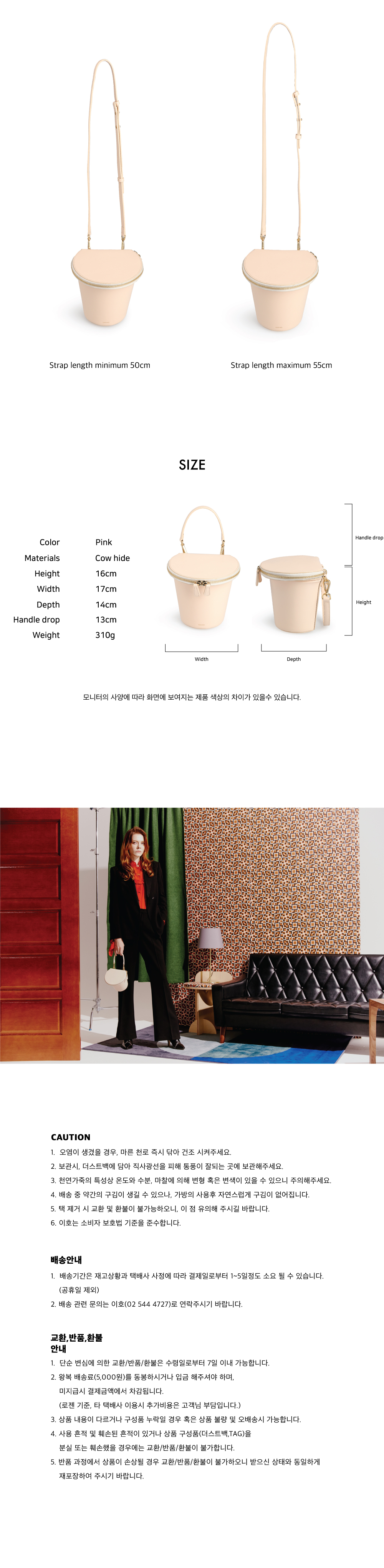 원형과 원통형이 합쳐진 형태로 상단에는 지퍼로 여밈이 되어 있으며 뒤에는 디링 장식으로 토트와 크로스가 다 가능한 스타일입니다.